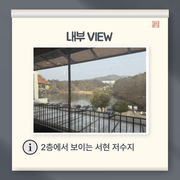 2층에서 서현 저수지가 보이는 뷰입니다. 창가쪽 자리 잘 잡으면 뷰를 즐기는데 어려움은 없어 보였습니다.