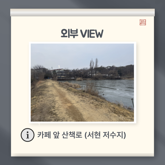 카페 바로 앞에 서현 저수지가 있어 아이랑 살짝 걷기 좋았습니다. 너무 큰 저수지는 뭔가 부담스러웠는데 적당한 크기의 저수지를 보면서 걷기 좋은 환경이었습니다.