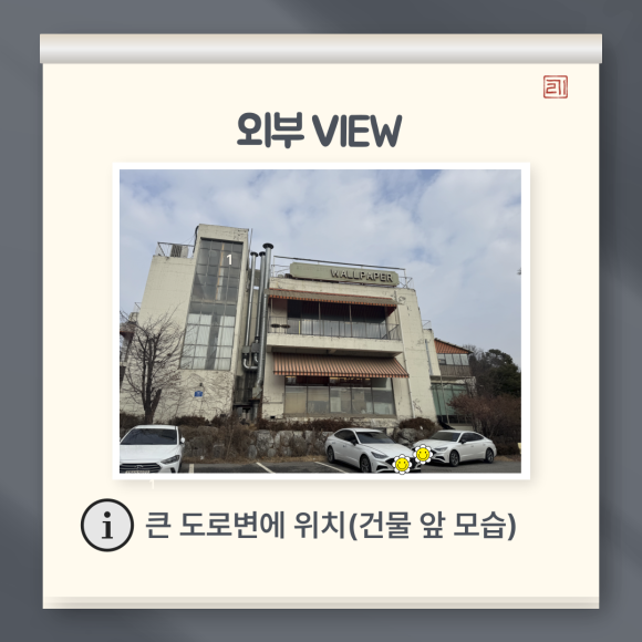 간판을 보고 우회전을 하면 월페이퍼 건물이 보이는데 입구는 건물 뒷편에 있어 주차장 입구를 지나 건물 뒷편으로 가시면 더욱 편리하게 주차 하시고 들어가실 수 있습니다.