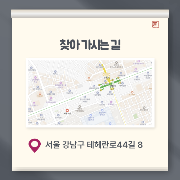 테헤란로 큰 대로변 보다는 안쪽에 위치해 있어 혼잡하진 않습니다. 매장