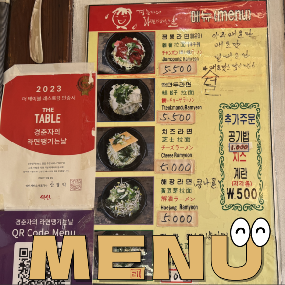 짬뽕라면은 덜 매운, 매운, 아주 매운맛 으로 구분되니 처음 가보신 다면 덜 매운짬뽕라면 추천 드립니다. 그래도 조금 부담 되시면 계란 추가 추천 드립니다.