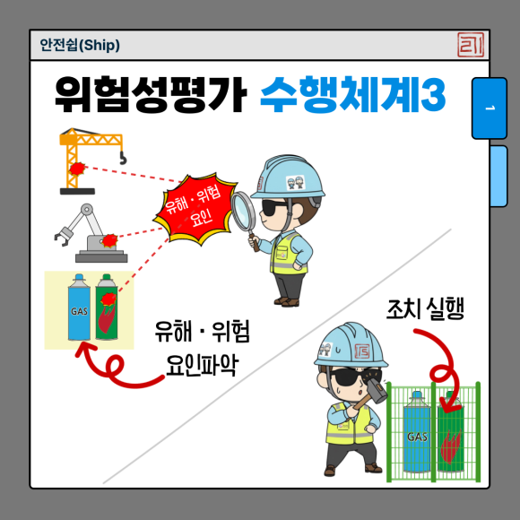 → 건설 등 작업 할 때 위험한 요인을 찾아야 합니다. 그리고 그 위험이 허용 가능한지를 평가하고 그에 맞게 조치해야 합니다.